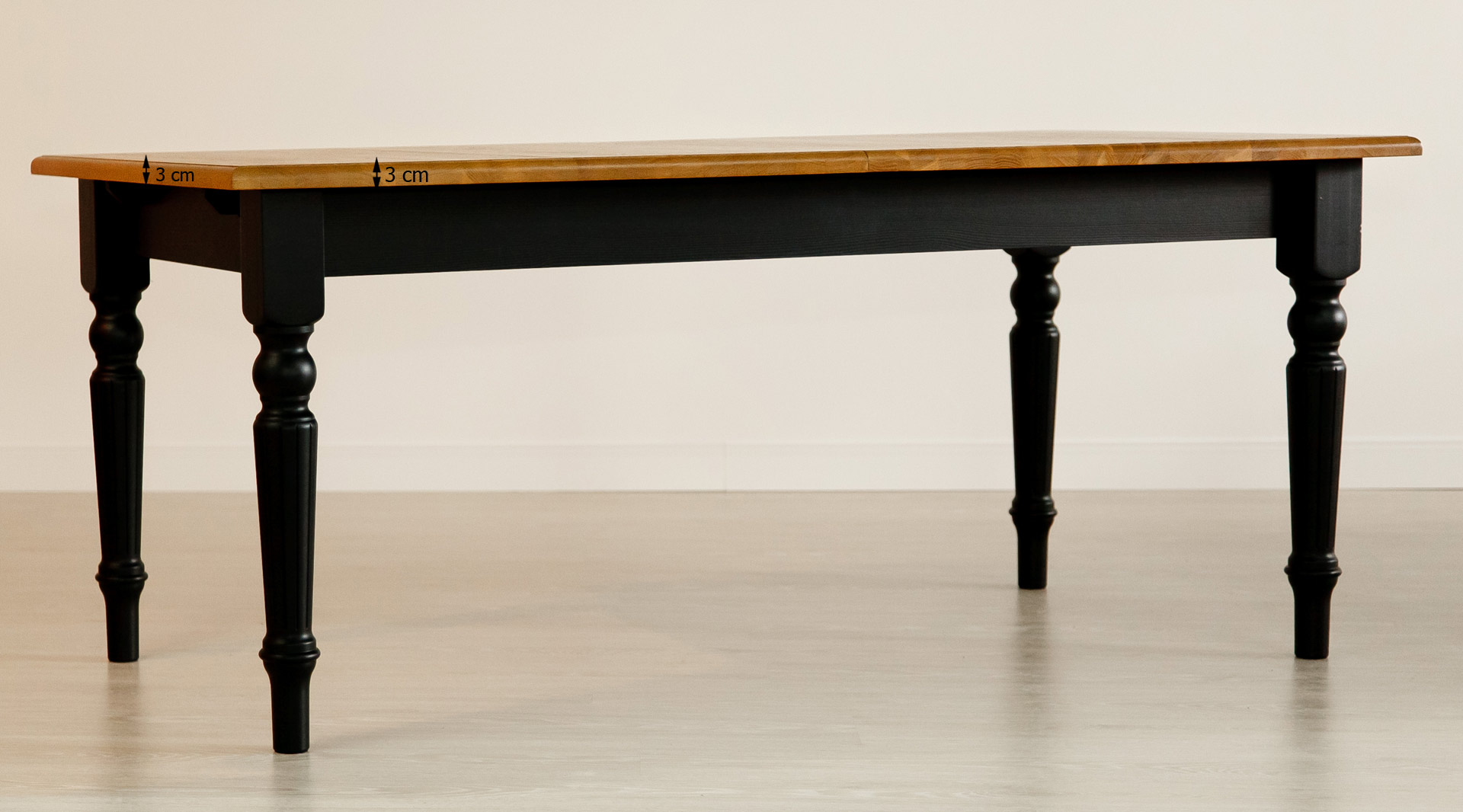 In der Basisversion wird der Tischkörper und die Beine in schwarzem Öko-Lack lackiert, hingegen die Platte im farblosen Öl behandelt wird. Es ist die Standardfarbe für diese Tische.