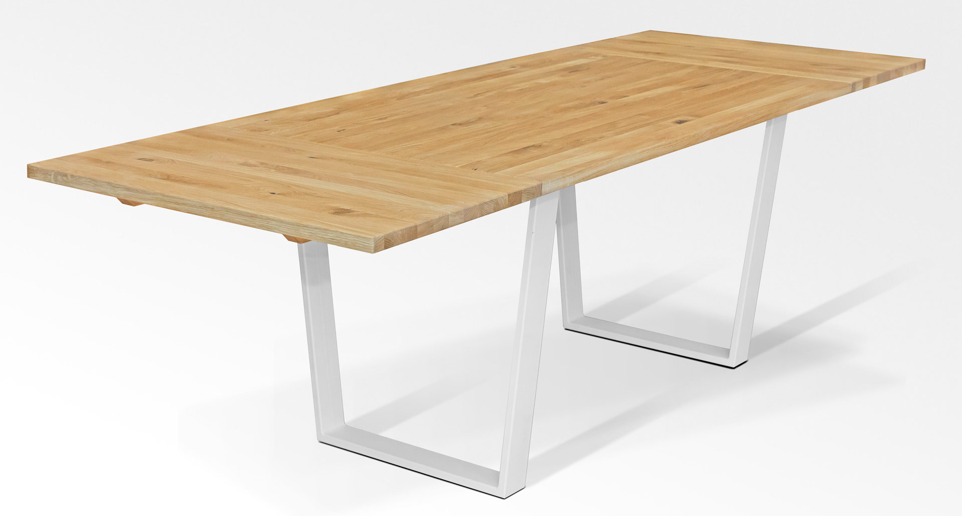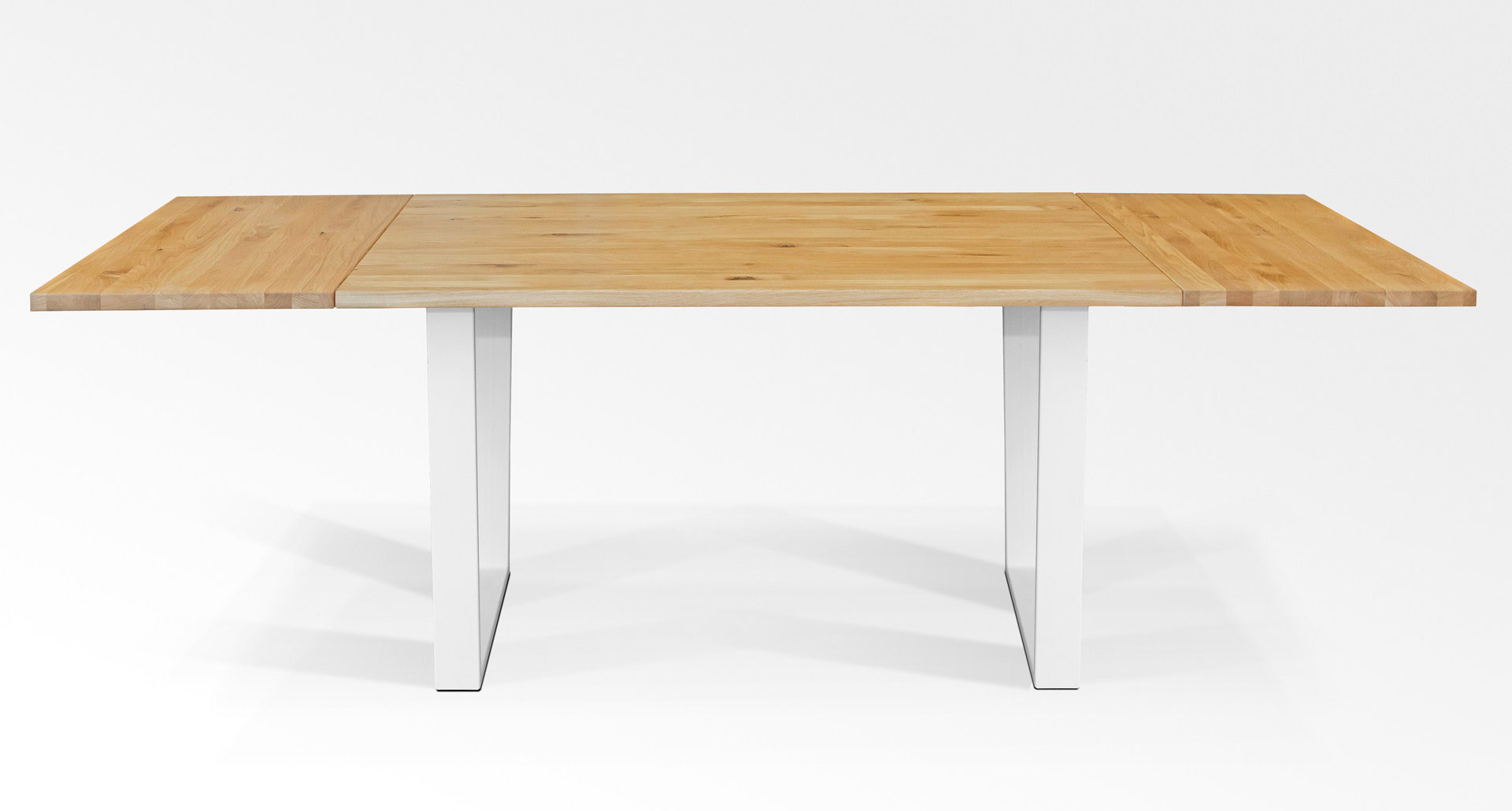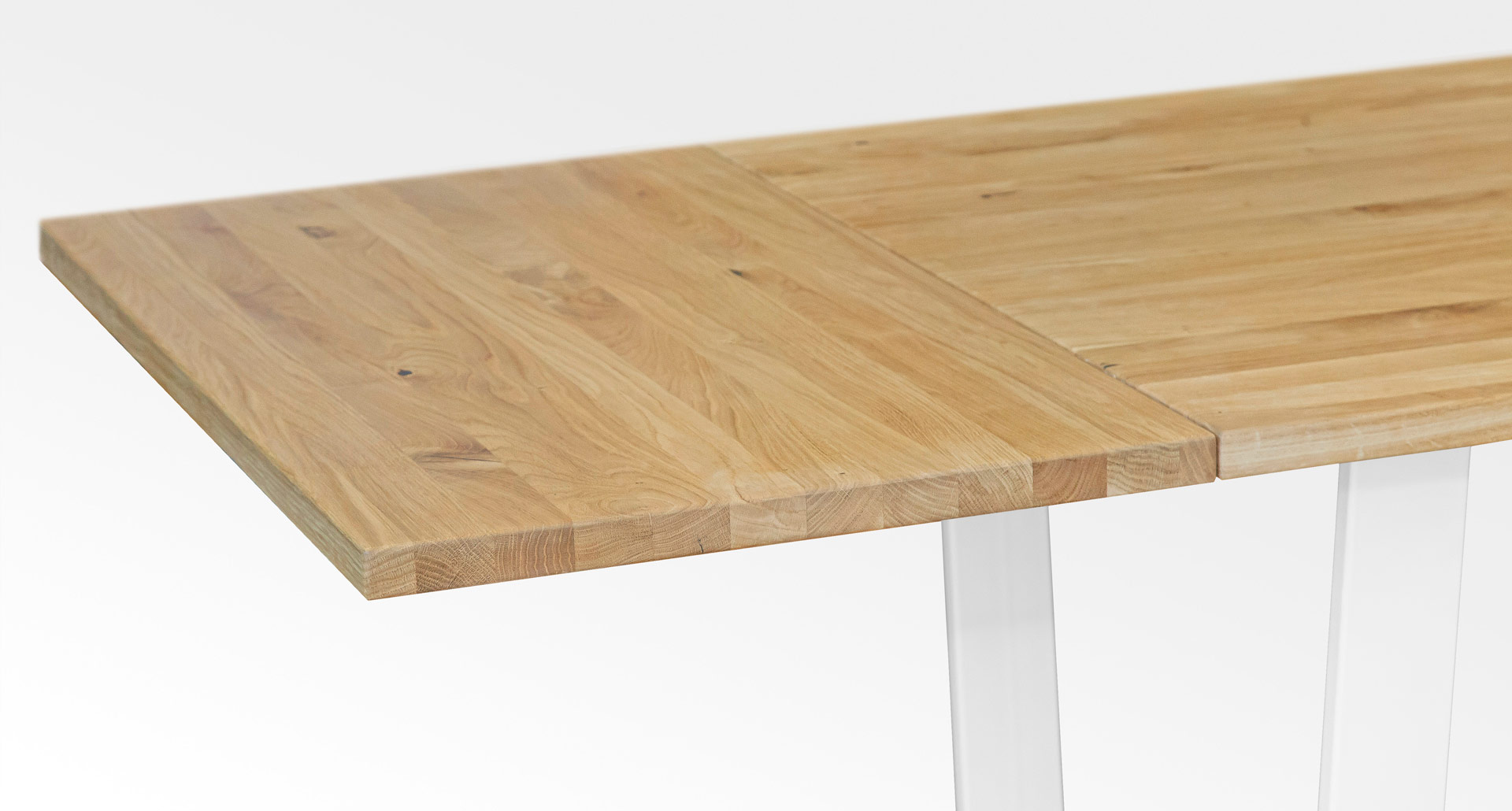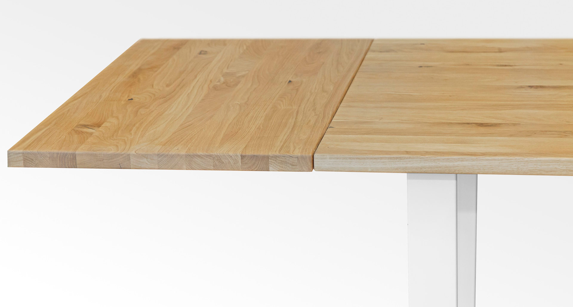 Die Tischplatten sind aus langen, massiven, durchgehenden Leisten gefertigt. Die Oberteile werden nicht aus kleineren Holzstücken zusammengefügt.