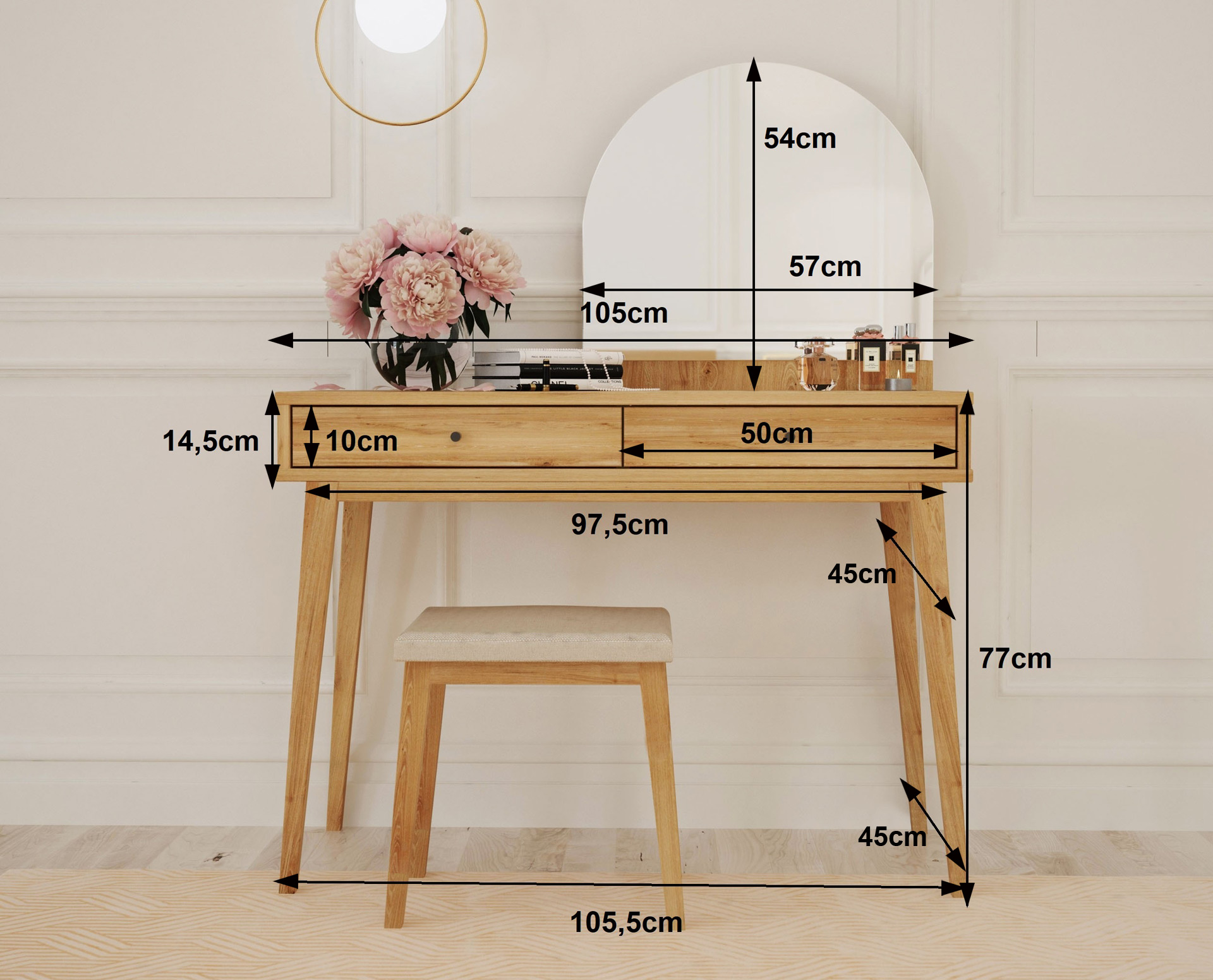 Das stilvolle Design des Schminktisches Malaga aus Eiche verleiht jedem Raum einen dezenten Touch.