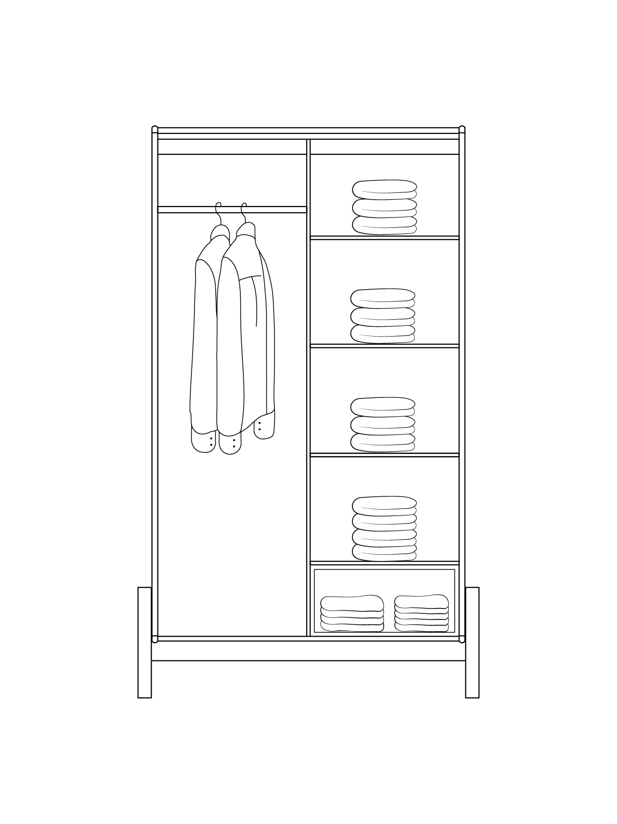 • in Version A: eine Kleiderstange im linken Bereich sowie drei Regalböden im rechten Bereich.