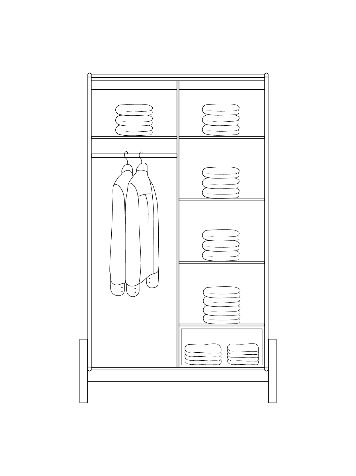 • in Version B: eine Kleiderstange und ein Regalboden im linken Bereich sowie drei Regalböden im rechten Bereich.